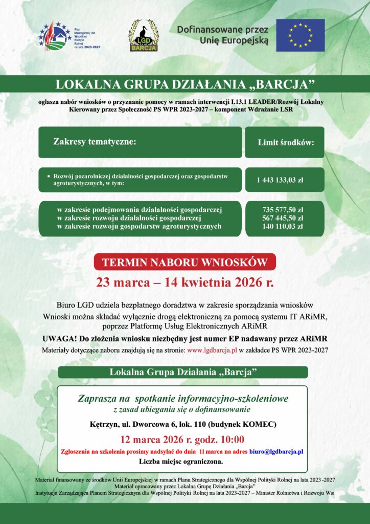 Lokalna Grupa Działania „Barcja” ogłasza nabory wniosków o przyznanie pomocy w ramach Rozwoju pozarolniczej działalności gospodarczej oraz gospodarstw agroturystycznych.