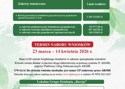 Lokalna Grupa Działania „Barcja” współfinansowana jest ze środków Unii Europejskiej w ramach działania 19 „Wsparcie dla rozwoju lokalnego w ramach inicjatywy LEADER”, poddziałania 19.4 ” Wsparcie na rzecz kosztów bieżących i aktywizacji” Programu Rozwoju Obszarów Wiejskich na lata 2014-2020
